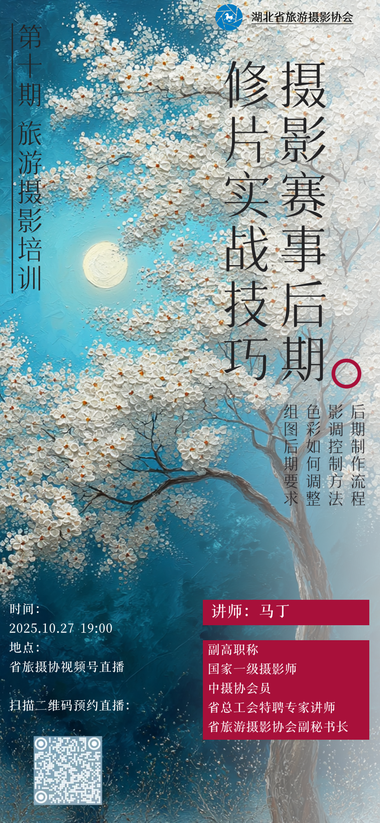 为更好地推进湖北省旅游摄影协会的发展,提升会员的专业技能,培养高素质专业人才,协会将组织开展2025年第十期旅游摄影培训,具体安排如下: