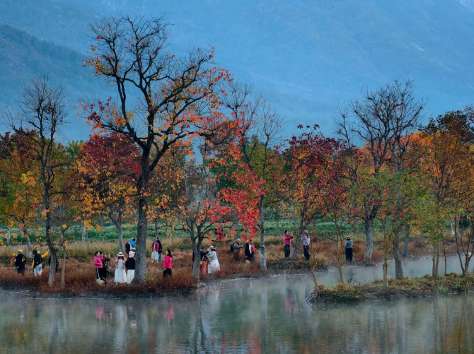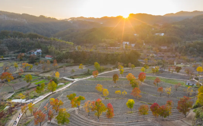 仪式落幕,采风大军即刻出发!摄影师们直奔圣人堂村。这个被誉为"中国最美红叶村"的地方,此时正上演着冬日限定浪漫——万亩乌桕树染红山野,青瓦白墙的民居点缀其间,炊烟袅袅中宛如水墨画卷。大家长焦短炮齐上阵,捕捉微风中摇曳的红叶、村民晾晒的秋粮,以及孩童嬉笑跑过的瞬间。